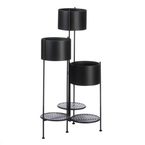 Showcase your plants with this contemporary matte black finish 3-tier plant stand. It's a modern, flexible approach that goes with any decor. Each planter barrel is 8.5" wide and will comfortably fit an 8" pot. The graceful stair step arrangement can display 3 large plants in a minimum amount of space. Additionally, 3 smaller plants can be placed on the bottom metal mesh shelves. Each tier measures 9" x 9". Interior of each bucket measures 8.5" x 8.5" Weight 8.4 pounds. 18" x 17.5" x 37". Iron.